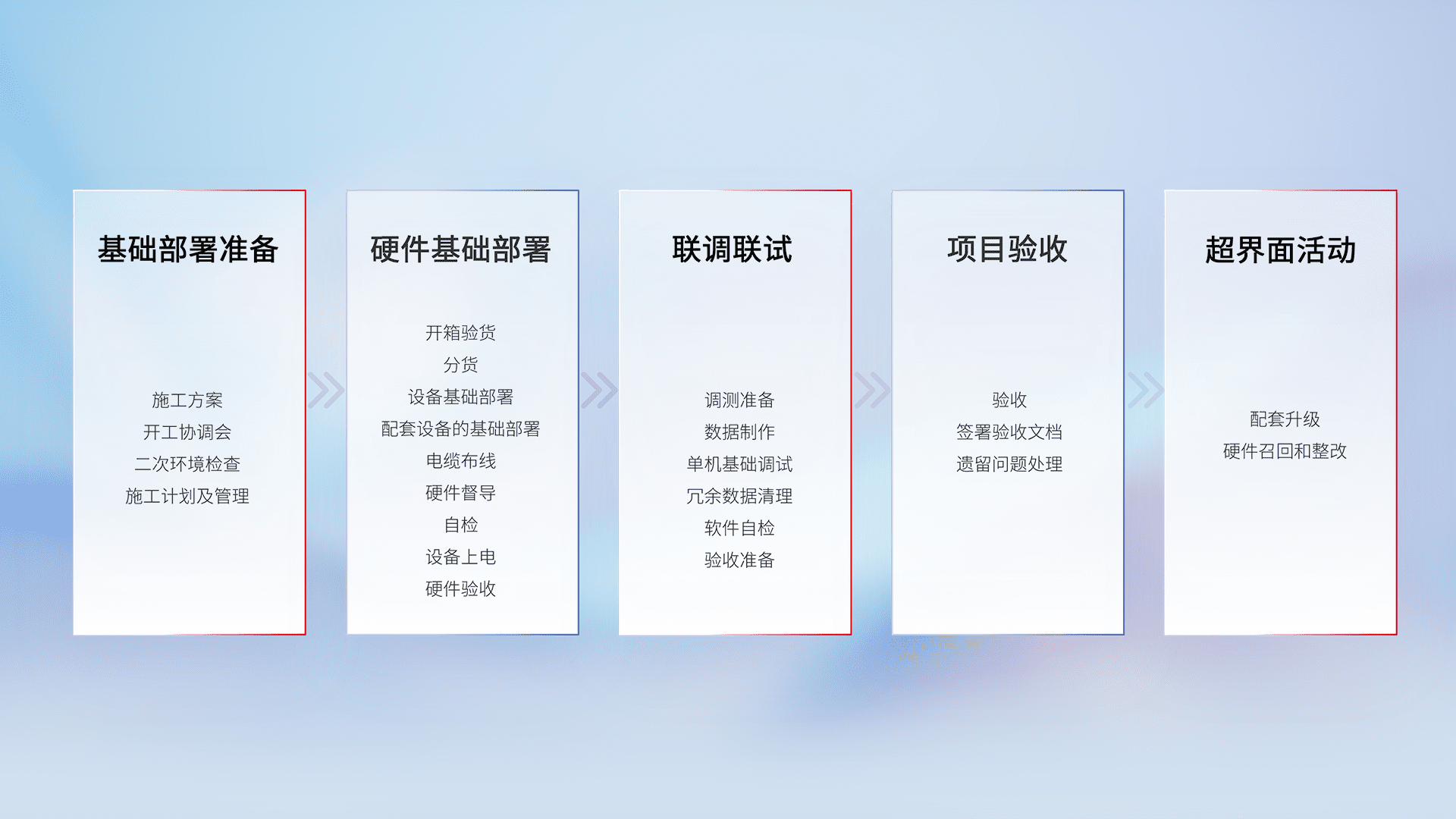 从基础部署准备、、硬件基础部署、、联调联试、、、项目验收、、、、越界面活动的全过程可追溯,,保证施工质量和进度。。